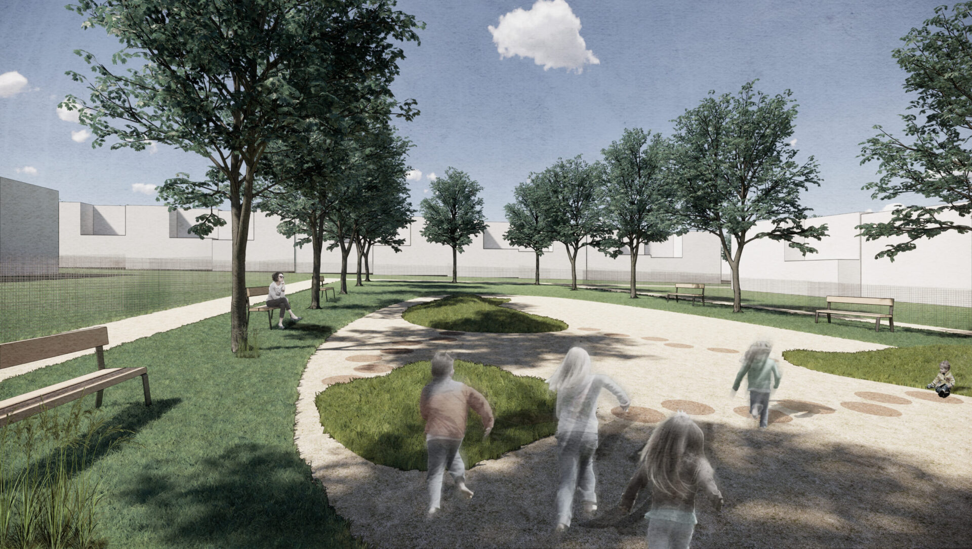 Urbanistická koncepce doplňuje stávající strukturu sídla, aby byla docílena variabilita i různorodost. Děje se tak prostřednictvím kombinace různé typologie bydlení: viladům, dvoj dům, řadový dům, rodinný dům. Objekty plynule navazují na regulované centrum i nižší stávající obytnou zástavbu. Nezapomněli jsem ani na veřejný prostor, který vytváříme prostřednictvím soustavy parkových ploch. Největší park obsahuje vyjma komponované zeleně také náměstí s výtvarným dílem, vodní plochu, pavilón se zahradní kavárnou a komunitním centrem a hřiště pro různé věkové kategorie budoucích obyvatel.