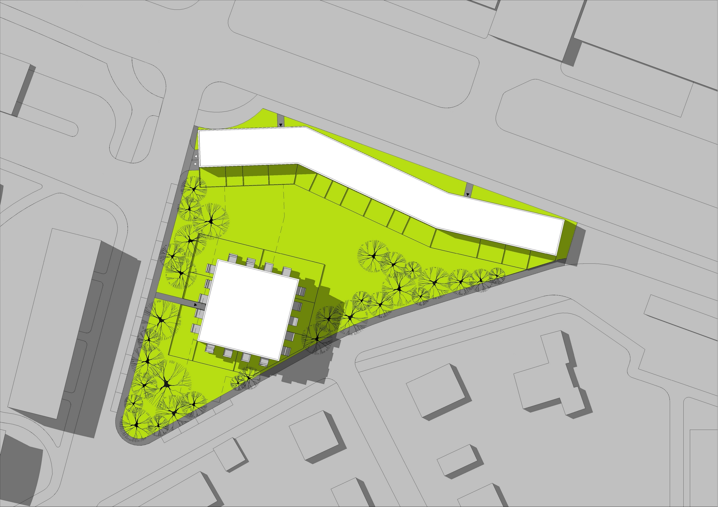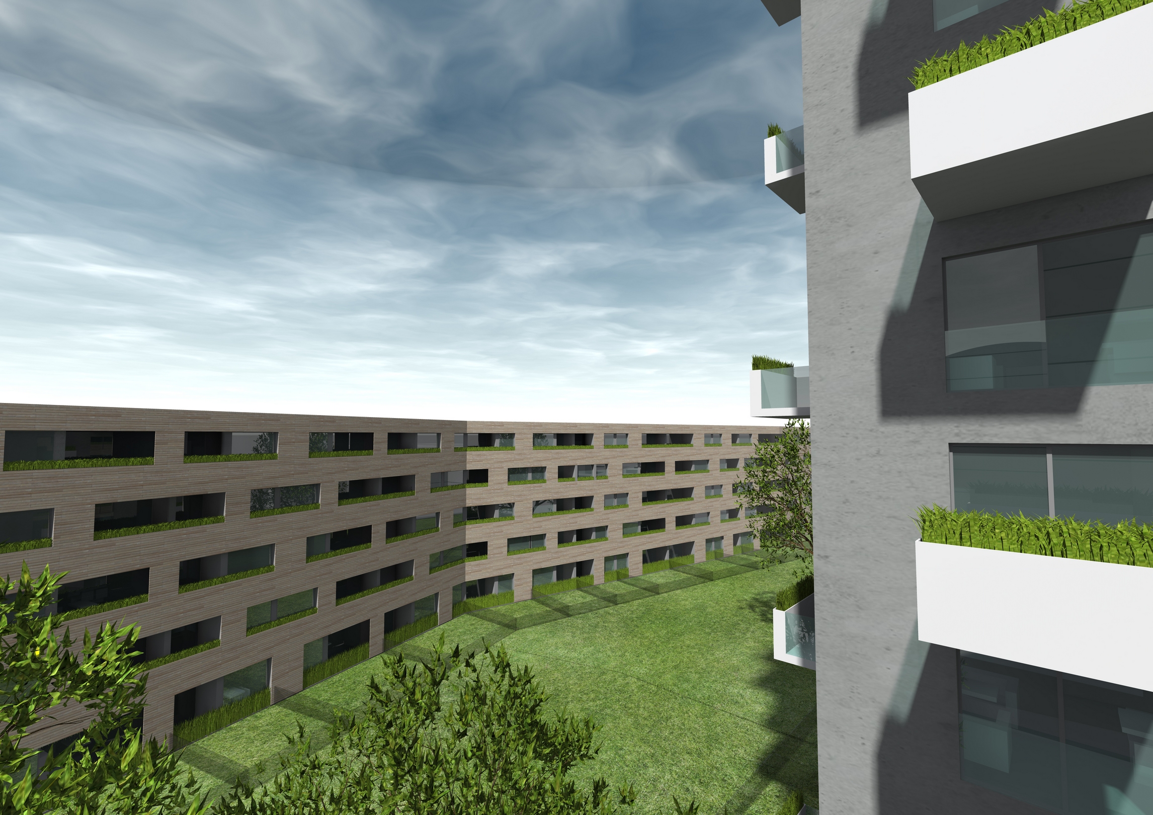Oba nadzemní objekty mezi sebou vytvářejí zklidněný volný prostor, který je maximálně věnován plochám zeleně. Plochy kolem fasád objektů jsou přičleněny bytům jako soukromé zahrady, ostatní plocha je polosoukromou zahradou přístupnou všem obyvatelům domu. Po obvodu jsou na rostlém terénu navrženy skupiny prvků vysoké zeleně, zajišťující celému prostoru vyšší intimitu a odstínění od okolí.
