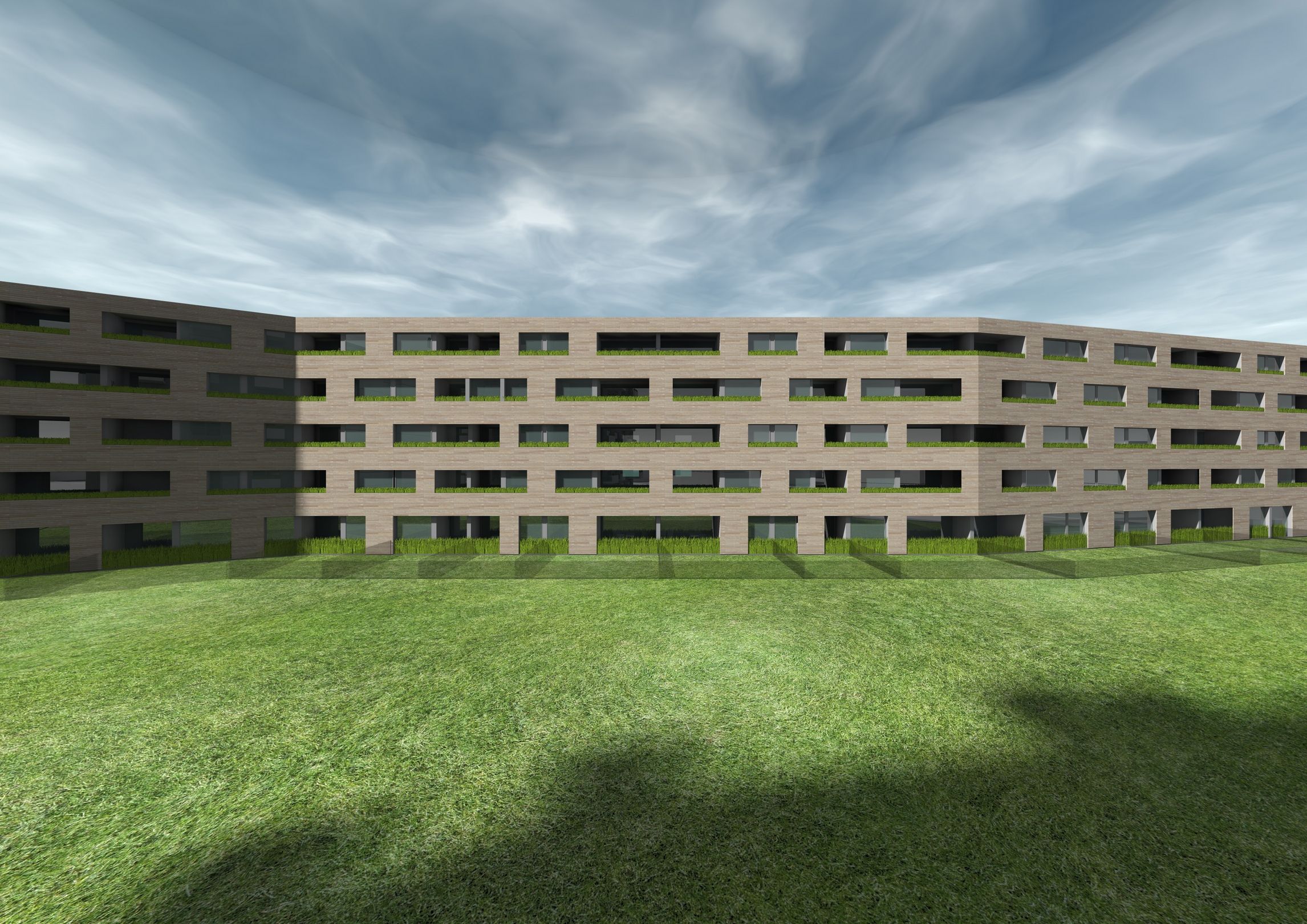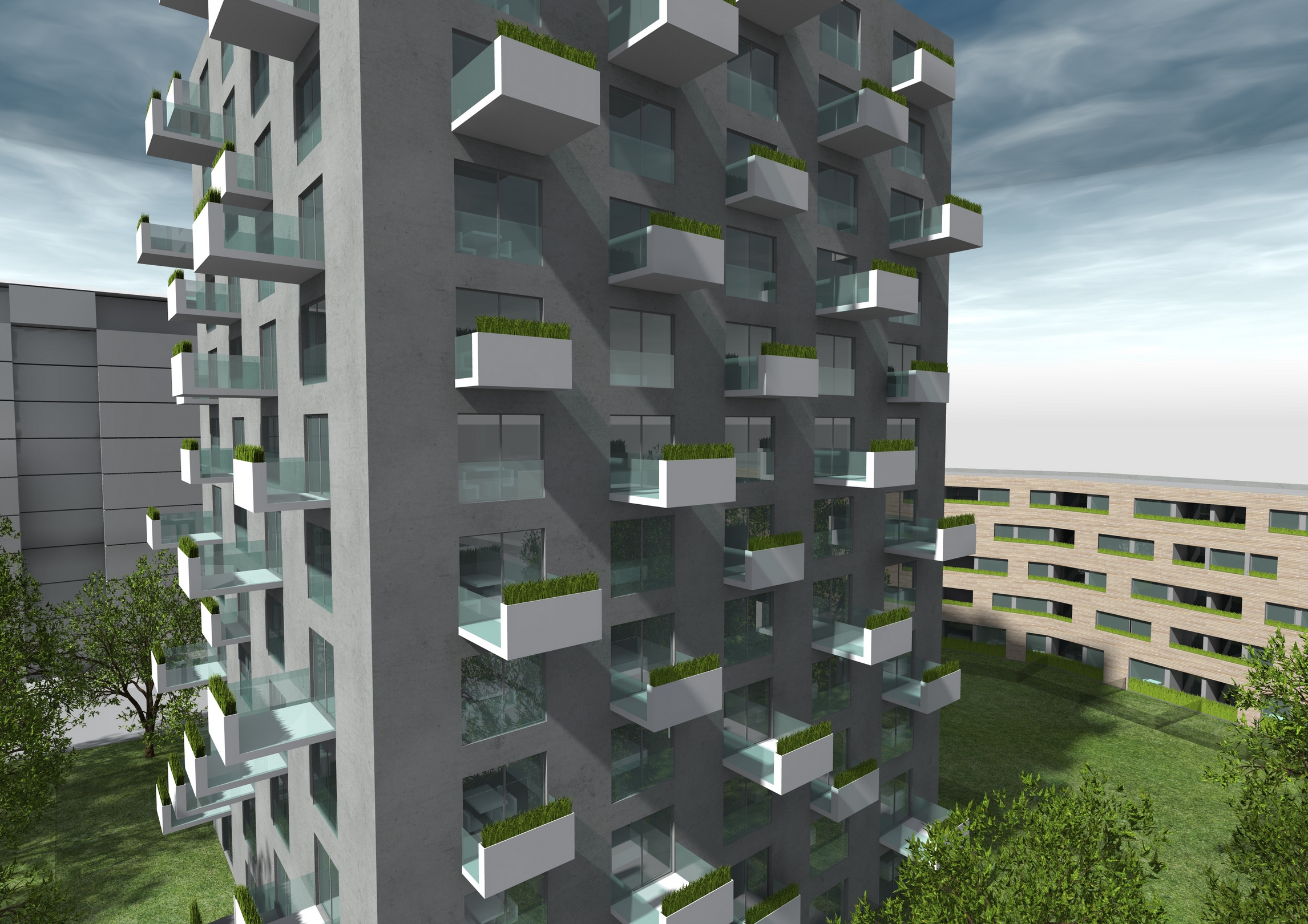 Základní hmotové řešení objektu bylo ovlivněno zejména akustickými poměry na pozemku a odstupovými úhly. Z tohoto důvodu bylo zvoleno řešení s dvěma odlišně pojatými objekty, umožňujícími maximální využití kapacity pozemku při nejvyšší kvalitě bydlení v jednotlivých bytech. Hmotovým řešením i designem fasád se oba objekty navzájem liší – vzhled odpovídá jejich odlišnému umístění na pozemku a rolím ochranného a chráněného objektu. Objekt A je hmotově výrazně horizontální, podélný, půdorysně dvakrát zalomený objekt, vinoucí se jako ochranná hradba či val podél severní hranice pozemku. Objekt B je naproti tomu koncipován více hmotově odlehčeně a rozehraně. Hmota domu je jednoduchý výrazně vertikální kubus se čtyřmi rovnocennými fasádami s rastrem velkých čtvercových oken. Sjednocujícím prvkem designu obou objektů je způsob ozelenění fasád lineárními květníky integrovanými do parapetů oken a lodžií na objektu A, respektive do zábradlí balkonů objektu B.