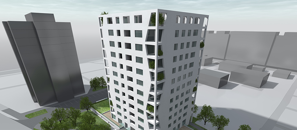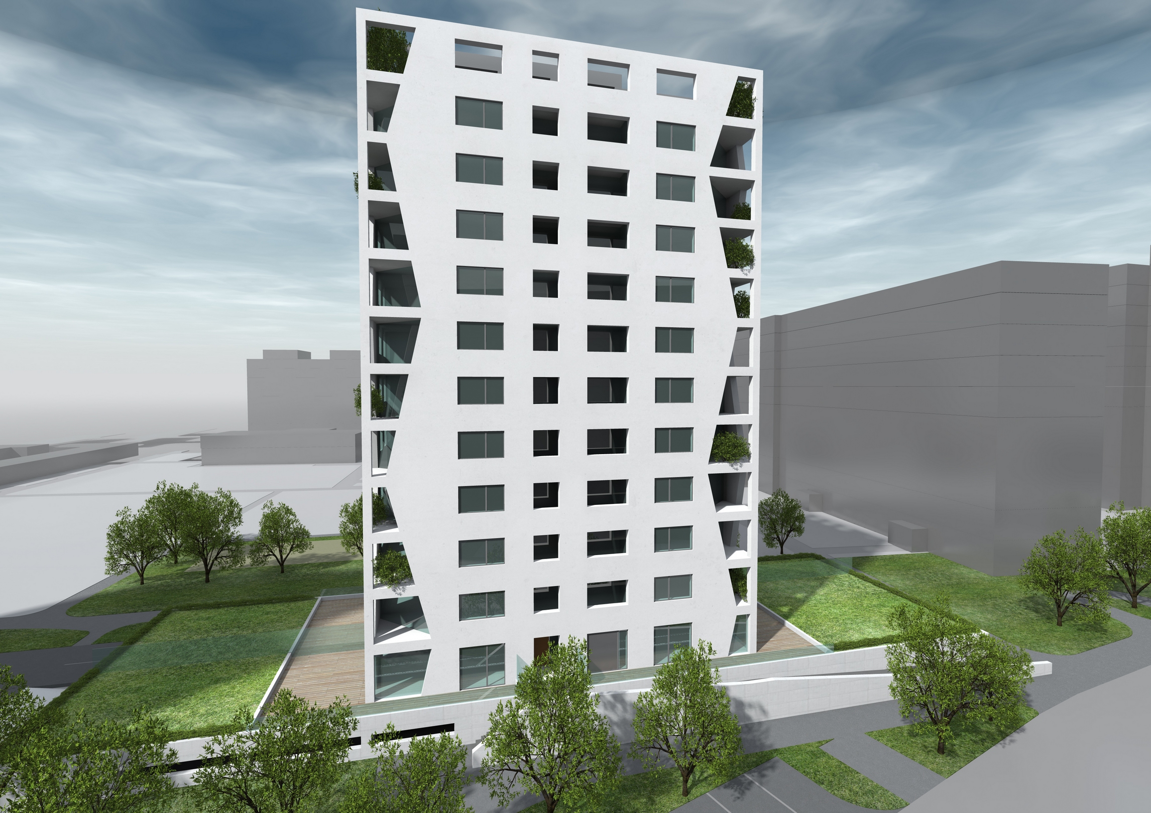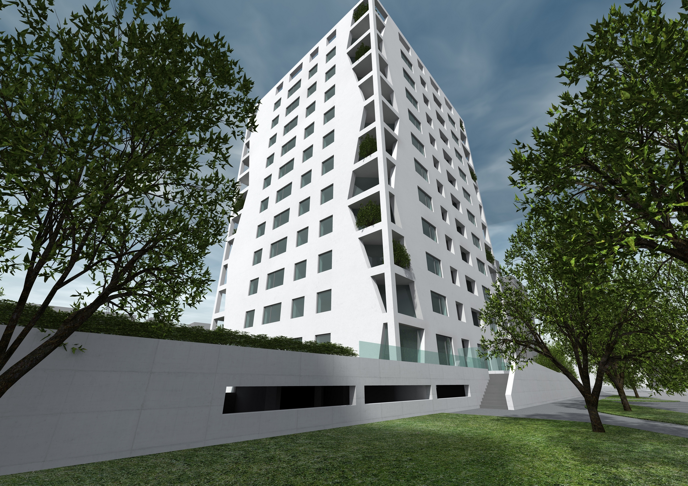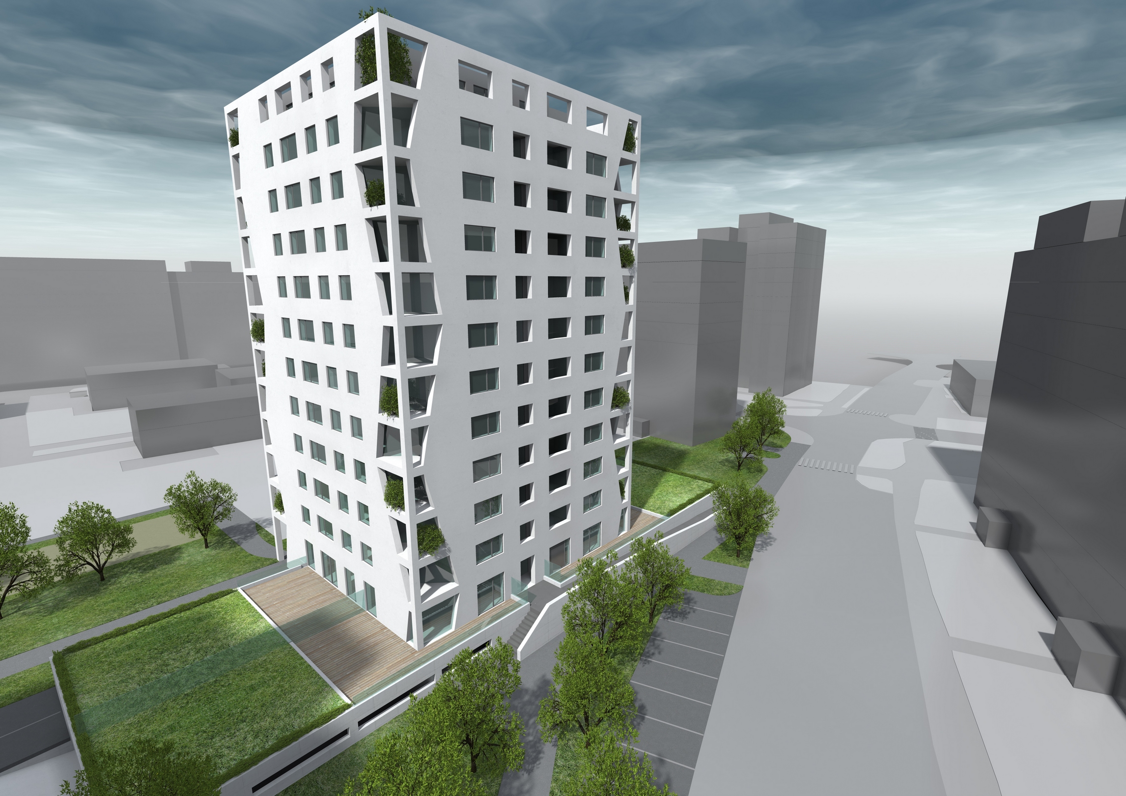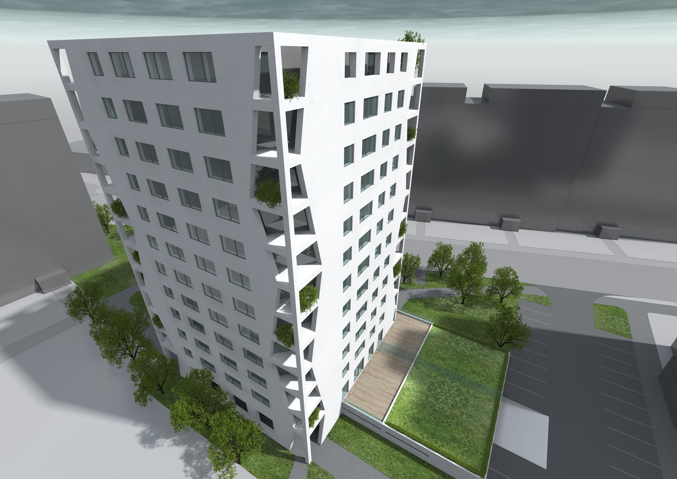 Návrh byl zpracován s důrazem na maximální zjednodušení původního hmotového řešení objektu za účelem vyšší ekonomičnosti stavby i provozu a soudobého architektonického výrazu. Zároveň bylo pracováno s editací hmoty objektu pro dosažení jedinečné siluety stavby a zdůraznění štíhlosti proporce. Z projektu byly odstraněny všechny zimní zahrady, rozsáhlé zasklené plochy a celkové velmi komplikované hmotvé řešení bylo výrazně zjednodušeno. Pro zajištění venkovní pobytové plochy ke každému bytu bylo zvoleno řešení se čtyřmi prostornými narožními pololodžiemi (k větším bytům) a dvěma menšími lodžiemi (k bytům menším) na každém typickém podlaží. Nárožní pololodžie zajišťují narozdíl od balkonů pocit soukromí uživatele, přičemž zásadně neprodražují obvodový plášť, nezvětšují obvod budovy a plochu ochlazovaných konstrukcí. Zároveň díky stavebně velmi jednoduchému zkosení přesahů stěn propůjčují objektu originální siluetu. Byty v nejvyšším podlaží disponují komfortními střešními terasami.