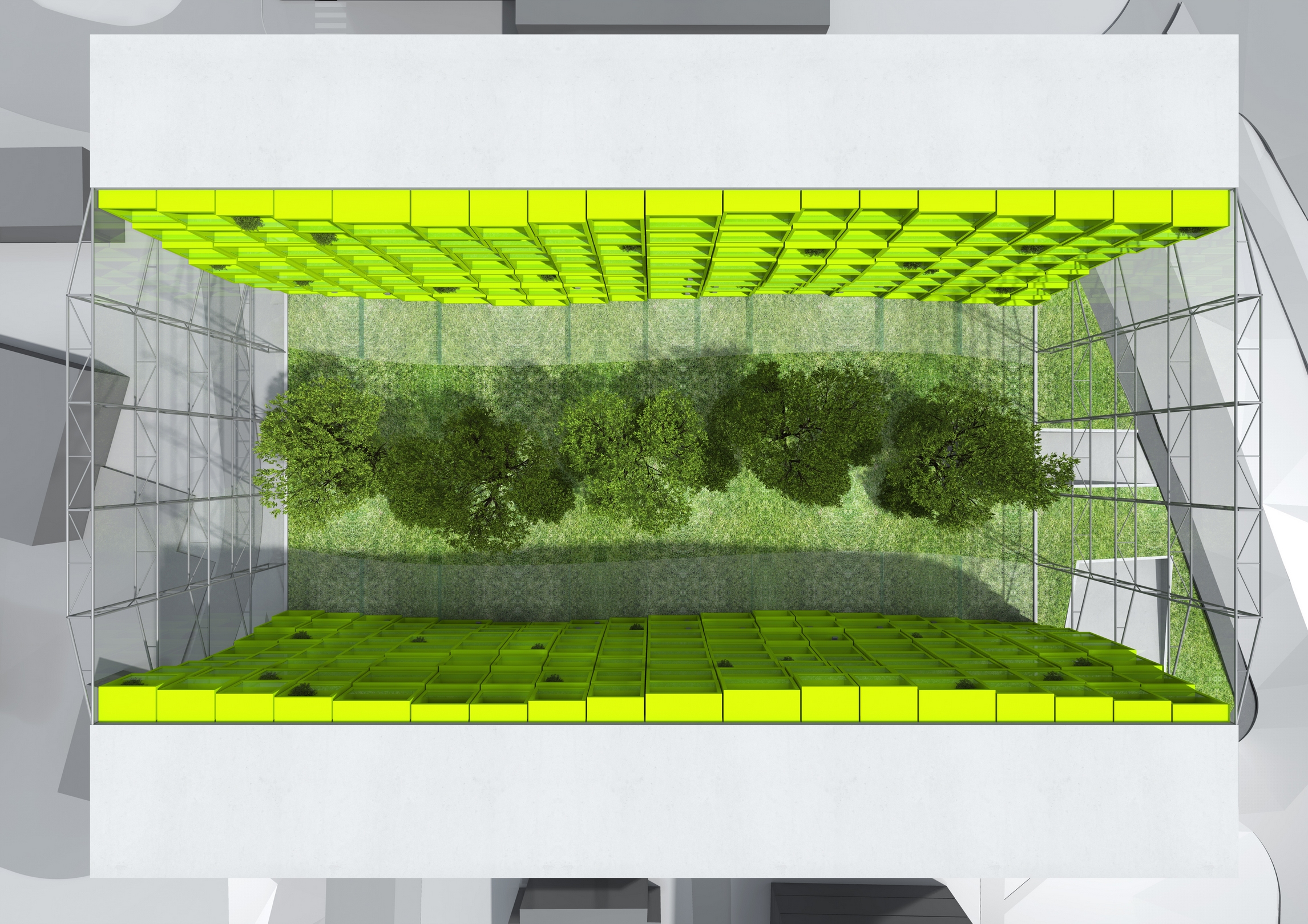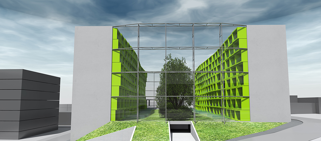 Hmotové řešení objektu bylo významně ovlivněno akustickými poměry na pozemku. Nutnost respektovat hygienické limity pro venkovní chráněný prostor staveb znemožňuje návrh konvenčního bytového objektu. Z tohoto důvodu bylo zvoleno řešení s dvěma protilehlými deskovými objekty doplněnými dvěma transparentními akustickými stěnami. Toto řešení umožňuje orientaci hlavních obytných prostor bytů do zklidněného a ozeleněného atria a doplňkové prosvětlení ostatních prostor bytů skrze zasklenou pavlač. Soukromí jednotlivých bytů je zvýšeno prefabrikovanými krytými lodžiemi, jejichž zelená barva a proměnlivá hloubka dodává fasádám orientovaným do atria svěží a organický ráz souznící s bujnou vegetací, kterou obklopují.