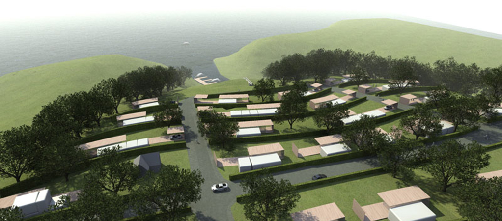 Jako hlavní benefit lokality přirozeně vnímáme blízkou vodní plochu. Díky jedinečné možnosti plavby ve skluzu bude klientela areálu pravděpodobně z velké části tvořena lidmi se zájmem o vodní sporty, zejména pak o lodě. V návrhu jednotlivých objektů proto pracujeme s nautickými prvky a tvary, zejména s tématem mola – terasy, a u něj kotvících plavidel – domů. Na jednotlivé pozemky klademe podélné dřevěné objekty, evokující přístavní mola, a integrující v sobě funkce hlavního obytného prostoru rekreačních objektů, kryté i nekryté terasy a krytého parkovacího stání. U těchto mol pak jako pomyslné jachty kotví objekty obsahující klidové části domů.