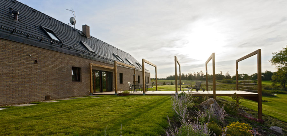 Objekt je navržen jako jednoduchá podélná stavba odkazující na tradiční venkovskou architekturu, respektující přání klienta i místní regulativy. Základní hmota domu je protnuta výrazným prvkem terasy, směřující jako pomyslné molo k břehu rybníka. Průnikem terasy a domu je definován tvar obývacího pokoje, který díky proskleným stěnám a shodnému řešení podlahy působí, jako by byl součástí mola směřujícího k rybníku. Zbytek domu je v souladu s požadavky investora spíše uzavřený, s důrazem na maximální soukromí každého z obyvatel i jejich hostů. Podélný charakter domu poskytuje rovnocenný výhled všem obytným místnostem a umožňuje optimální dispoziční zónování a flexibilní členění objektu v budoucnosti.