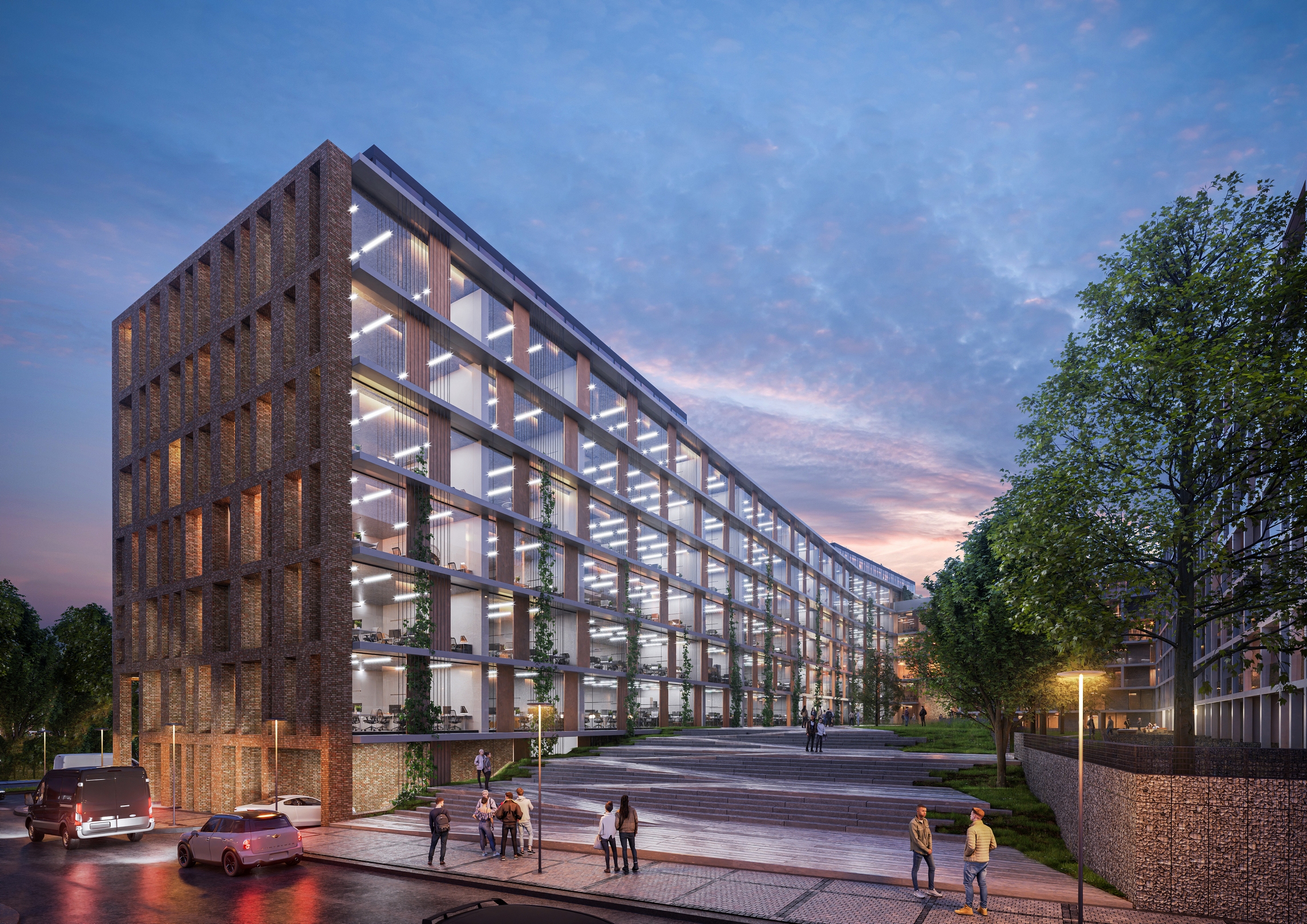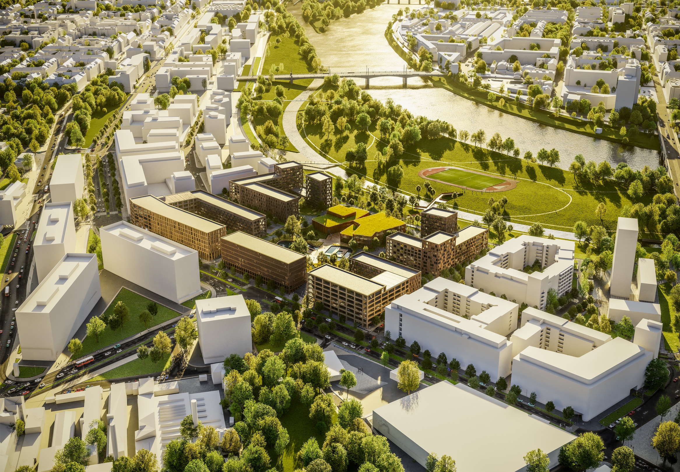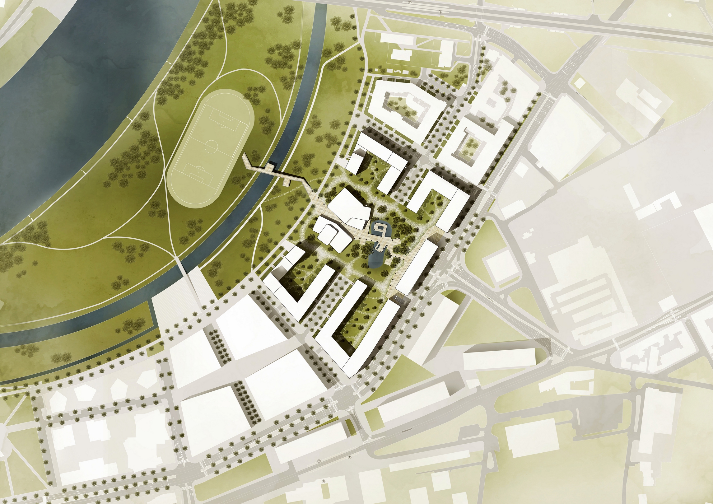 Bloky zástavby se tak dostávají do přímého kontaktu s říčním charakterem, který vnímáme jako jednu z hlavních hodnot této oblasti. Pracujeme s atributy jako retenční jezírko nebo přístavní molo, které přechází vodní hladinu a tvoří osu celého souboru. Bloky domů (administrativa, bydlení, škola) jsou upraveny do tvaru U a tím se otevírají do prostoru vnitřního parku. Téma říčního koryta prostupuje nejen parterem, ale jeho ozvěna je patrná i v koncepci fasád jednotlivých domů.