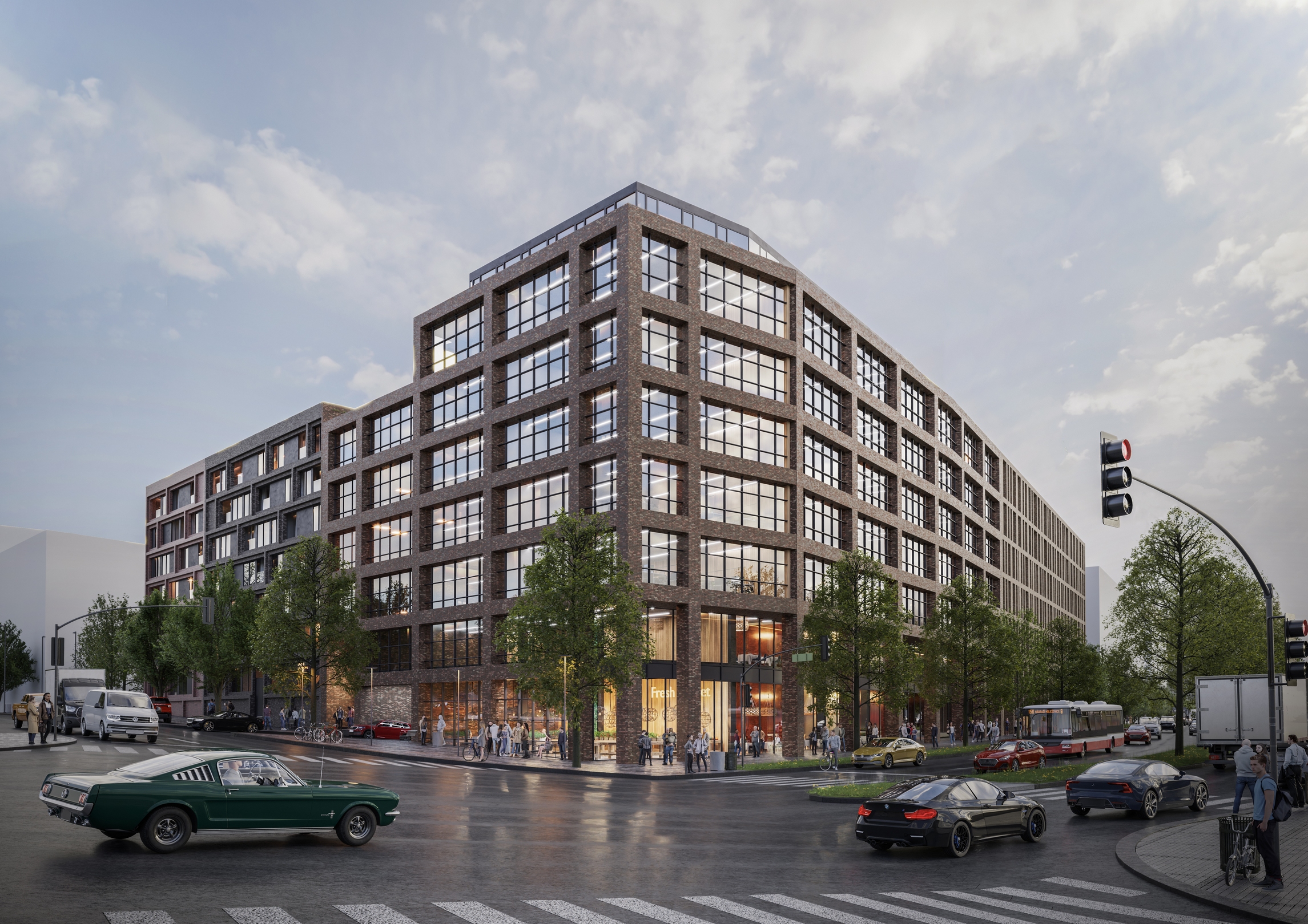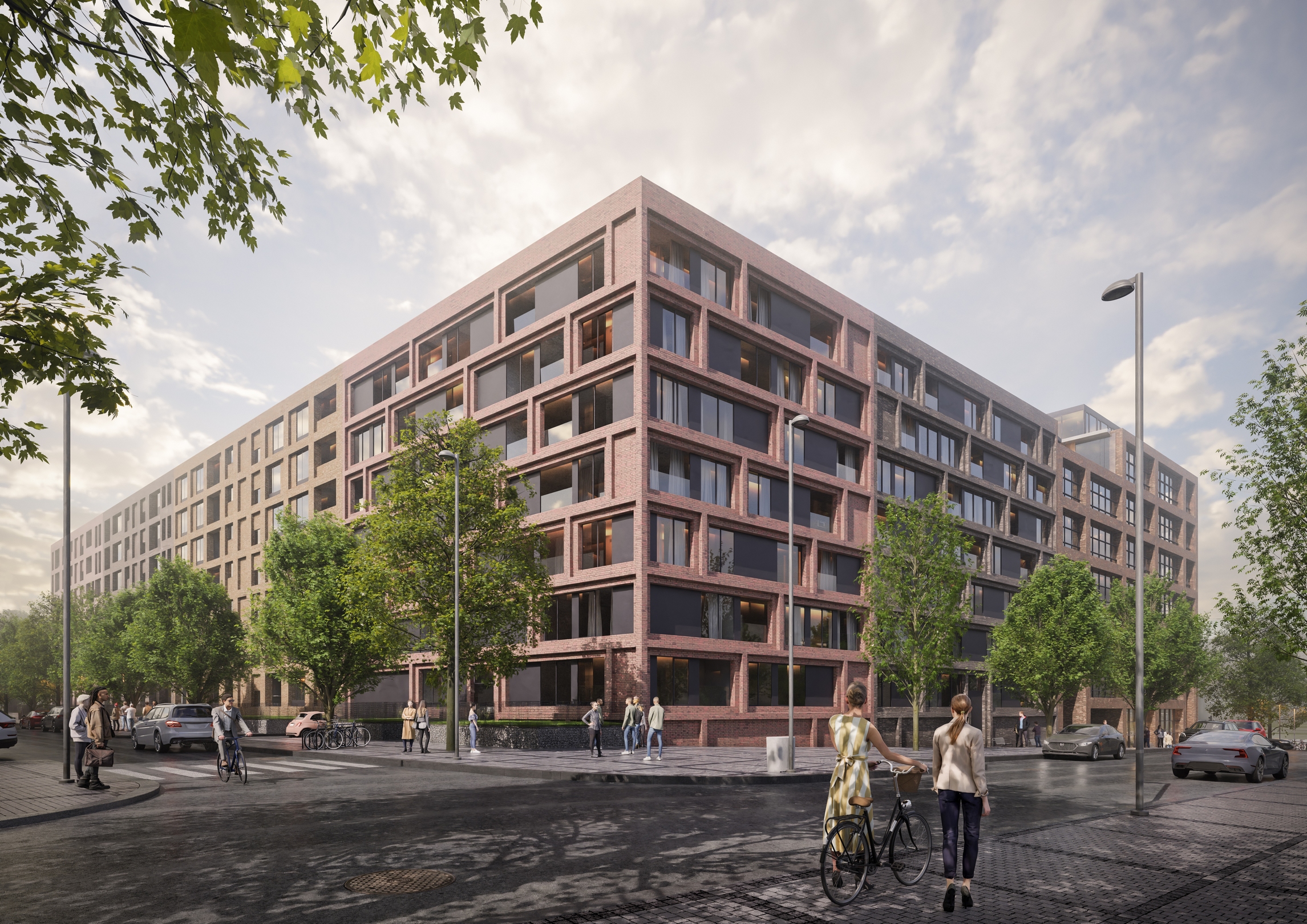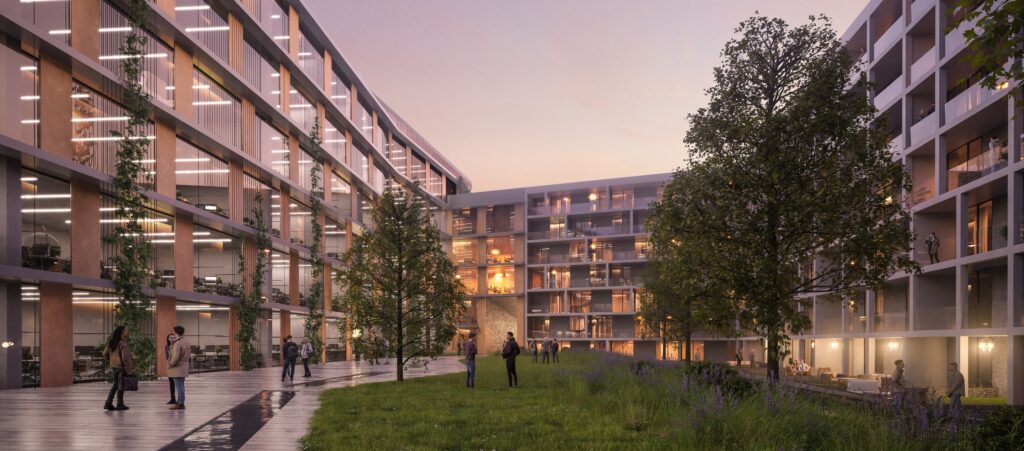 Bloky zástavby se tak dostávají do přímého kontaktu s říčním charakterem, který vnímáme jako jednu z hlavních hodnot této oblasti. Pracujeme s atributy jako retenční jezírko nebo přístavní molo, které přechází vodní hladinu a tvoří osu celého souboru. Bloky domů (administrativa, bydlení, škola) jsou upraveny do tvaru U a tím se otevírají do prostoru vnitřního parku. Téma říčního koryta prostupuje nejen parterem, ale jeho ozvěna je patrná i v koncepci fasád jednotlivých domů.