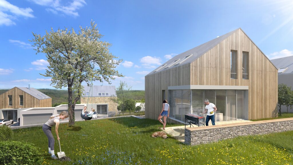 Nový soubor se do tohoto prostředí snaží nenásilně vstoupit. Domy mají malou, +skoro čtvercovou půdorysnou plochu a jsou seskupeny tak, aby mezi nimi vznikal co největší volný prostor vyplněný zahradami. Vznikají tak pro oblast specifické průhledy zástavbou podporující pocit volného prostoru v přírodě.
