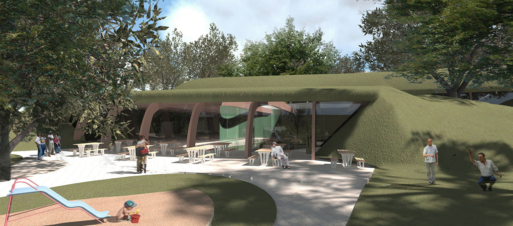 Cílem této studie bylo vytvořit kvalitní společenské a sportovní zařízení, které by se stalo přirozenou součástí krajiny Českého krasu v obci Třebotov. Vzhledem k rozměrům provozů a velikosti archetypu domu oblasti byl zvolen koncept krajinného objektu, který je pouze součástí modelace terénu a vizuálně působí pouze pomocí přirozených linií a hmot. Měřítko budov je přes jejich objemy drobné a jsou vnímány jako horizontální zářezy v terénu. Střechy jsou zelené a svou orientací umožňují existenci společenstev teplomilné stepi. Parter je rozdělen do tří základních zón. Jedná se o zcela veřejnou část pozemku, sloužící jako park s naučnou stezkou Českého krasu a arboretem, část tenisových kurtů a část privátní.