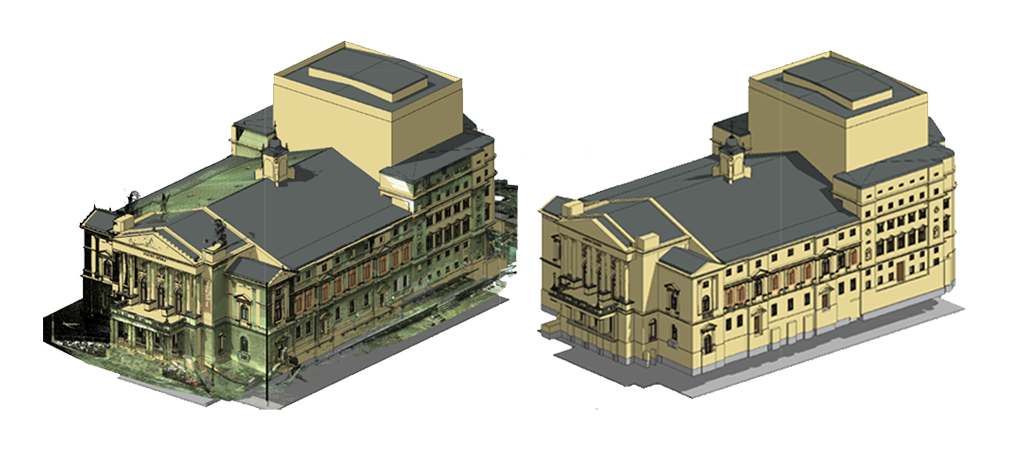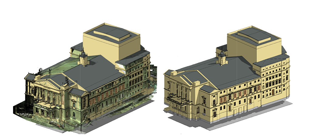 Na základě historické dokumentace a prvotní fotodokumentace vznikl 3D model obou objektů. Objekt byl poté osazen do geodetického půdorysného vytyčení a historická budova byla zaměřena metodou 3D scanování. Následně proběhla půdorysná a výšková korekce modelu a byly zapracovány další informace typu dispozičních úprav oproti původní dokumentaci, orientace dveří a pozice zařizovacích předmětů. Na základě 3D scanu byly vyneseny organické tvary historické budovy.