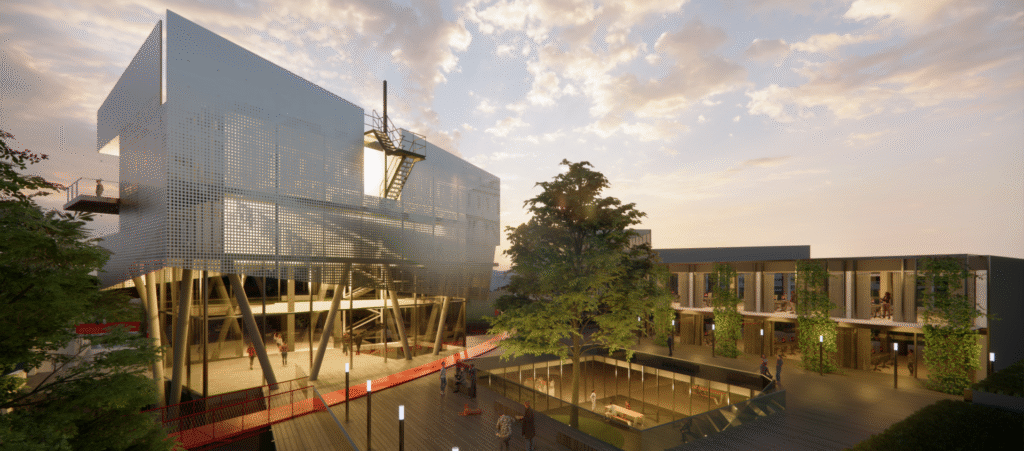 Návrh centra pracuje s areálem bývalé školy jako s kreativním různorodým prostorem, v kterém se doplňují funkce a instituce. Je to místo, které nabízí dialog mezi veřejnými (městskými) a komerčními sférami zájmu. Tyto vrstvy se v něm prolínají a architektonickými prvky funkčně propojují. Vrchní vrstva tvořící náměstí na střeše 1.NP je primárně zaměřená na veřejný prostor a služby, na okolí je napojena bezbariérovou lávkou. Vstupní halou, vertikálními jádry a atriem je provozně i opticky propojena s komerční vrstvou coworkingu, inovací, vývoje, firem a výroby o patro níže. Jednotlivé části objektu jsou variabilní a otevírají možnosti mezioborové spolupráce, v co největším možném rozsahu. Zachovávané původní konstrukce a hodnotná zeleň jsou doplněny novými objemy, které optimalizují provozní vazby a splňují nové požadavky na funkce areálu, budovu zkompaktňují a zkracují provozní vazby. Tím návrh řeší hospodárně a smysluplně konverzi původního areálu.