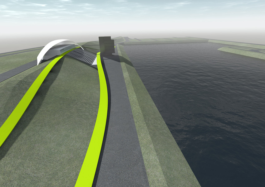 Zadáním studie byla rekonstrukce stávající tribuny v areálu vodních sportů v Račicích. V koncepci návrhu byl kladen důraz na nenarušení jedinečného génia loci. Urbanistické řešení i architektonický návrh vycházející z místních podmínek a evokující svými liniemi vodní vlny. Důkladnou analýzou provozu areálu byly doplněny chybějící vazby pro lepší propojení nových i stávajících objektů. Návrh se také snaží o maximální využití stávajícího terénu pro konstrukci nových objektů. Byl kladen důraz na ekonomičnost a bezproblémovou etapizaci stavby.