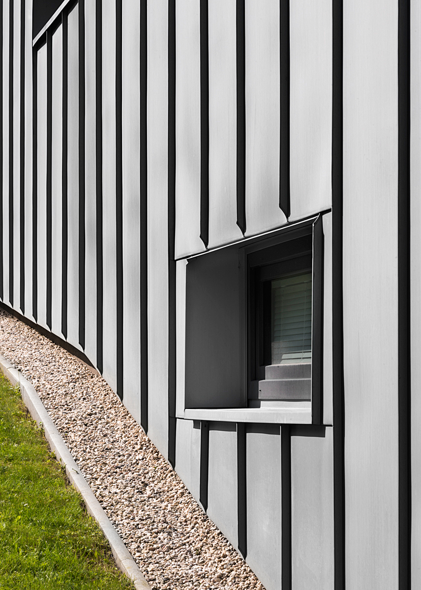 Princip tvarování domu je zdůrazněn materiálovým řešením exteriéru i interiéru. V obou případech jsou všechny povrchy definované tažením – tedy boční obvodové stěny a střecha – provedeny v jednotném materiálu. Pro vnější povrchy je použit falcovaný plech, pro povrchy vnitřní pak dřevěná prkna. Ostatní plochy domu – štítové stěny a interiérové stěny bloku zázemí – jsou provedeny v bílé barvě.