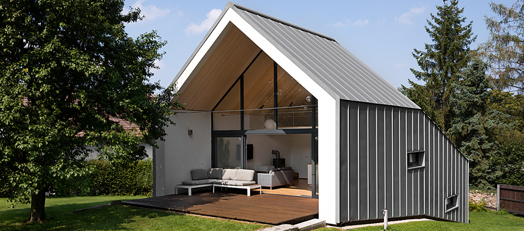 Nedaleko návsi v klidné středočeské vesničce se ukrývá malý rodinný dům. Dům je koncipován jako víkendové bydlení pro čtyřčlennou rodinu a výhledově potom jako trvalé bydlení pro dva. Stojí na rozhraní dvou výškových úrovní pozemku – níže položené severní vstupní části a výše položené jižní zahrady. Tvar objektu je vytvořen tažením profilu tradičního venkovského domu po zalomené trajektorii vyplývající z terénního zlomu. Tímto řešením je umožněn vstup do domu v nižší úrovni od vstupu na pozemek a zároveň výstup z hlavního obytného prostoru na výše položenou úroveň zahrady.