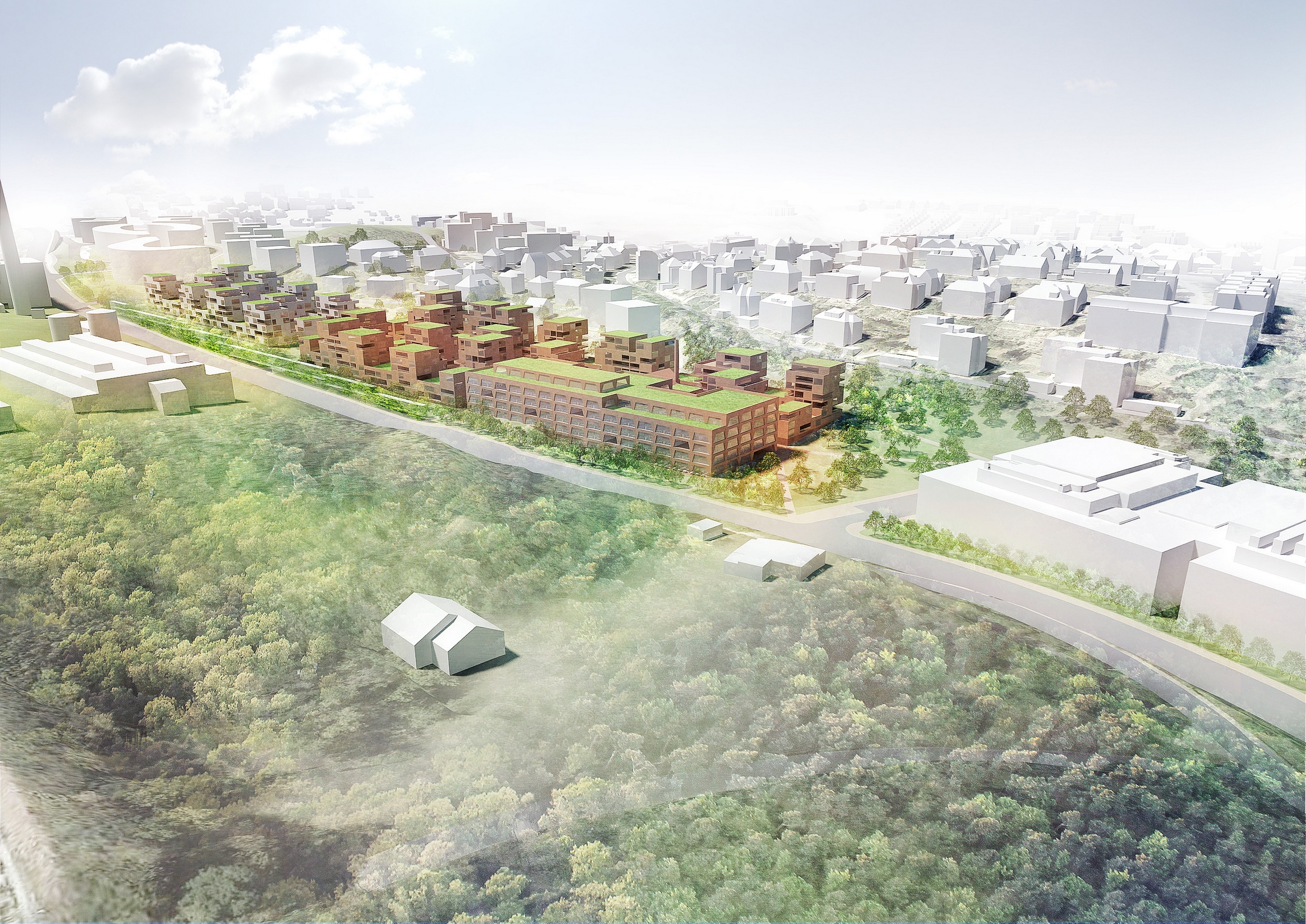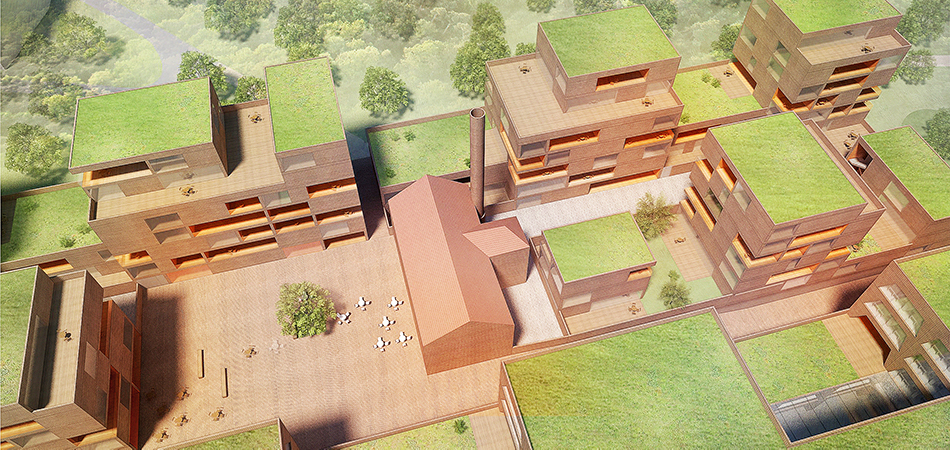 Soubor, jenž do sebe integruje rezidence i administrativní budovu, je cloněn od rušné ulice skleníkem. Skleník by umožnil pěstovat zeleninu a přebytečné teplo využít jako zdroj pro vytápění kanceláří. Menší blok s byty navazuje na větší kru a propojuje dříve realizované etapy Waltrovky. Skleník s protihlukovou stěnou je protažen i před menší blok. Krajina a topografie tím jsou respektovány a posíleny.