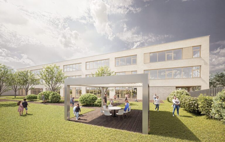 Koncepčně je areál navržen tak, aby veškeré hmoty školní budovy zůstaly soustředěny v západním sektoru pozemku a elegantně se vyhnuly zúžené části, která je vymezena dvěma proti sobě orientovanými trojúhelníkovými parcelami, jež nejsou ve vlastnictví školy. Tímto jasným uspořádáním vzniká na jedné straně kompaktní plocha určená pro samotnou školní budovu a navazující funkční celky sportovišť a hřiště, zatímco na straně východní se otevírá velkorysý prostor pro školní nádvoří, který zároveň slouží jako přirozený veřejný předprostor.