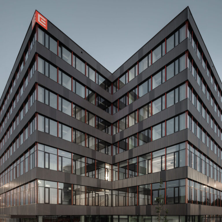 Architektonické řešení navazuje na jednoduchý tvar budovy. Prostory jsou uspořádány do sedmi nadzemních a jednoho podzemního podlaží. Fasádu stavby tvoří jednoduché schéma horizontálních pruhů pásových oken prostřídaných plnou fasádou s plechovým ob-kladem. Toto schéma je použité na celé stavbě s cílem vytvořit vizuální jednoduchost výrazu budovy. V místě vstupní haly objektu je využito zasklení bez pevného parapetu pro zvýraznění haly na fasádě objektu. Pásová okna v jednotlivých podlažích jsou dělena dle administrativního modulu stavby, aby vznikla možnost maximálně variabilního půdorysu stavby. Modul na fasádě je v administrativních podlažích rozdělen na úzký otvíravý segment a fixní zasklení. Každý modul kanceláře je tedy vybaven otvíravým oknem.