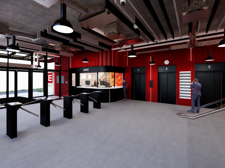 V administrativních patrech je na montované příčky aplikován foliový polep (z vnitřní strany mezi skla příčky), který reprezentuje patra, nebo přímo divize a oddělení v EDU. Tento polep je převzat z obrazů částic viditelných v mlžné komoře. Tyto jinak neviditelné částice instalované na sklech v pásu od 500 po 2150 mm umožňují docílení soukromí v kanceláři.